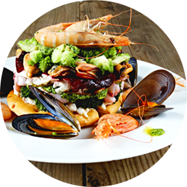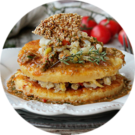 Distribuite sul fondo del piatto uno stato sottile di pesto rosso di basilico. Poggiate sopra il primo disco di farinata. Coprite con un po' di ragù bianco di merluzzo e coprite con il secondo disco di farinata. Versate al centro ancora un po' di ragù bianco di merluzzo, versate ancora un po' di pesto rosso di basilico e completate con il croccante al sesamo e rosmarino.
