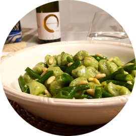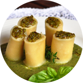 Per la glassa al pesto: mettere in ammollo la colla di pesce. Frullare pinoli, basilico, olio e 65g di panna. In un pentolino riscaldare la rimanente panna, appena sarà ben calda inserire la colla di pesce ben strizzata e farla sciogliere completamente. Aggiungere questo ultimo composto al pesto e amalgamare per bene. Mettere il sale q. b.