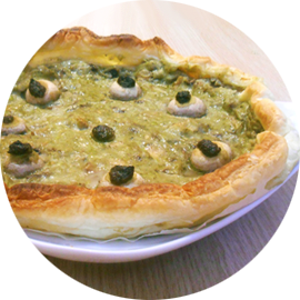 Prendere il rotolo di pasta sfoglia, metterlo su una teglia da crostata, bucherellarla, farcirla e poggiarci sopra le teste di fungo rimaste intere decorandola come si desidera.