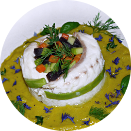 Inserire il filetto di orata in un coppapasta, disporre al centro i dadini di verdure con qualche rametto di timo e di finocchietto, salare e pepare. Cuocere il filetto di orata con il coppapasta in un forno a vapore a 100° per 15 minuti.