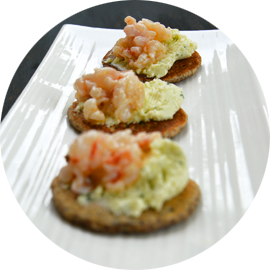 Date una spatolata di prescinseua al basilico ad ogni blini e un cucchiaino di gamberi cotti nel limone (fatti scolare dalla marinata).