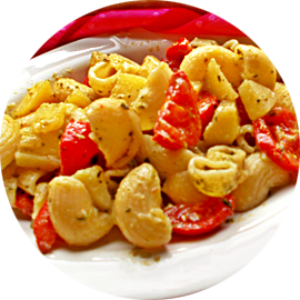 Pestate i pinoli con il sale. Aggiungere le foglie di basilico lavate in acqua ghiacciata e fatte asciugare su di un canovaccio. Aggiungere i formaggi poi aggiungere l'olio a filo. Adesso aggiungete i pomodorini tagliati a pezzetti. Per ultimo, aggiungere poca acqua. Per una versione veloce, usare un mixer elettrico.